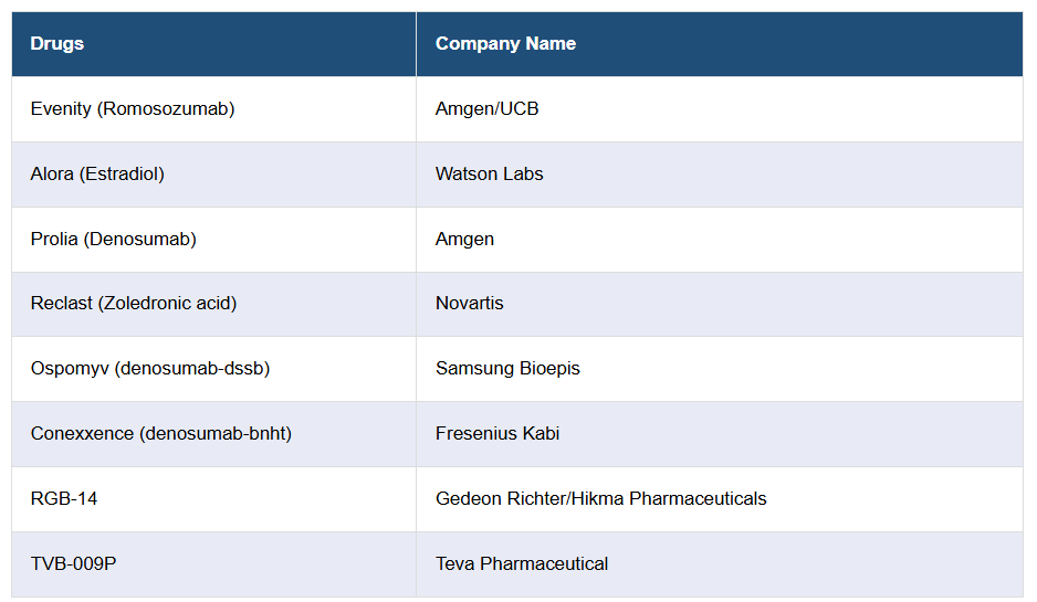 • 2024年10月、テバ・ファーマシューティカル・インダストリーズ社は、プロリア(デノスマブ)のバイオシミラー候補であるTVB-009Pについて、米国FDAが申請を受理し、欧州医薬品庁(EMA)が申請を承認したと発表しました。
