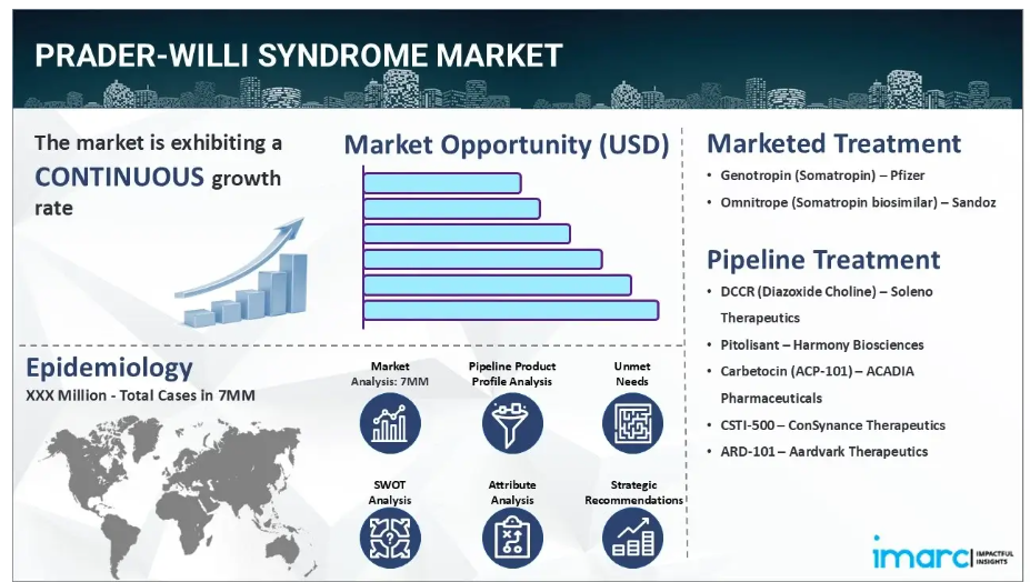 IMARC社の新報告書「プラダー・ウィリー症候群市場規模、疫学、市場内医薬品売上高、開発中の治療法、および地域別見通し 2025-2035」において、プラダー・ウィリー症候群市場が包括的に分析されました。プラダー・ウィリー症候群とは、通常は父親から受け継がれる15番染色体上の特定の遺伝子の欠失によって生じる、まれな遺伝性疾患を指します。この疾患は、慢性的な空腹感、肥満、知的障害、行動上の問題など、特徴的な症状パターンを呈します。その他の一般的な症状としては、性器の発育不全、成長・身体発達の遅れ、頑固さ、低身長、認知機能障害、運動発達の遅れ、言語障害、かんしゃく、ホルモン分泌の低下、斜視などが挙げられます。プラダー・ウィリー症候群の患者様は、不安障害や気分障害などの精神疾患を併発する場合もあります。本疾患の診断は、主に患者の申告症状、病歴、一般的な血液検査の評価に基づきます。医療従事者は、症候群を示す染色体の異常や変化を特定するため、DNAベースのメチル化検査を実施する場合もあります。さらに、蛍光in situハイブリダイゼーションや染色体マイクロアレイ解析など、様々な診断手順を用いて、基礎症状の他の可能性のある原因を除外します。