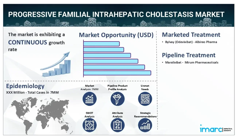 IMARC社の新報告書「進行性家族性肝内胆汁うっ滞症(PFIC)市場規模、疫学、市場内医薬品売上高、開発中の治療法、および地域別展望」において、進行性家族性肝内胆汁うっ滞症市場が包括的に分析されました。進行性家族性肝内胆汁うっ滞症(PFIC)は、肝臓の胆汁分泌能力に影響を及ぼす希少な遺伝性疾患であり、進行性の肝障害を引き起こし、最終的には肝不全に至る可能性があります。PFICには主に3種類の種類があり、疾患を引き起こす特定の遺伝子変異に基づいて分類されます:種類1、種類2、種類3です。一般的な症状には、持続的なかゆみ、皮膚や眼球の黄変(黄疸)、体重増加不良または体重減少、腹部の腫れなどが含まれます。PFICの子供は、疲労感、脱力感、成長・発達の遅延も経験する場合があります。診断には通常、病歴聴取、身体検査、各種臨床検査を組み合わせて行います。初期検査には、肝機能を評価する血液検査や、肝臓と胆管を調べる超音波検査、MRI、CTスキャンなどの画像検査が含まれます。PFICが疑われる場合、PFICの原因となることが知られている遺伝子変異を特定するため、遺伝子検査が推奨されることがあります。さらに、肝障害の程度を評価し、他の肝疾患を除外するために、肝生検が行われることもあります。