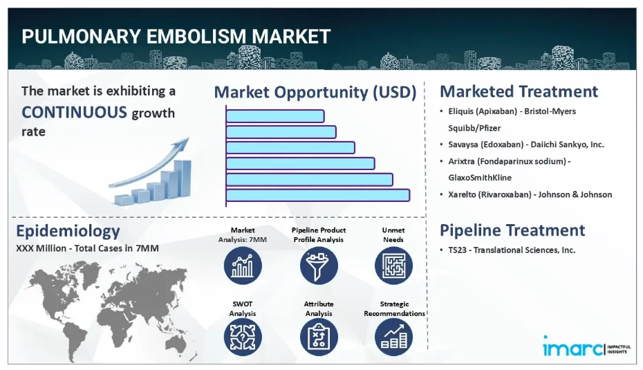 IMARC社の新報告書「肺塞栓症市場規模、疫学、市場内医薬品売上高、開発中の治療法、および地域別展望」において、肺塞栓症市場が包括的に分析されました。肺塞栓症(PE)とは、通常は脚や体内の深部静脈で発生した血栓が肺に移動し、肺の血管の一つまたは複数を塞ぐ状態を指します。これにより肺が損傷を受け、身体の重要な臓器に届く酸素量が減少します。PEは迅速に治療されなければ生命を脅かす可能性があります。PEの症状は血栓の大きさや位置によって軽度から重度まで様々です。一般的な症状としては息切れ、胸痛、血痰が挙げられます。その他の兆候としては、立ちくらみ、動悸、脚のむくみなどが含まれます。肺塞栓症の診断には通常、胸部X線検査、CTスキャン、血液検査などの組み合わせが行われます。また、血栓が分解される際に生成されるタンパク質断片のレベルが上昇しているかどうかを確認するため、Dダイマー検査も実施されます。肺塞栓症の治療には通常、ヘパリンやワルファリンなどの抗凝固剤を使用し、血栓を溶解させ、新たな血栓の形成を防ぐことが含まれます。場合によっては、カテーテルによる血栓溶解療法や機械的血栓除去術を用いて血栓を除去することもあります。