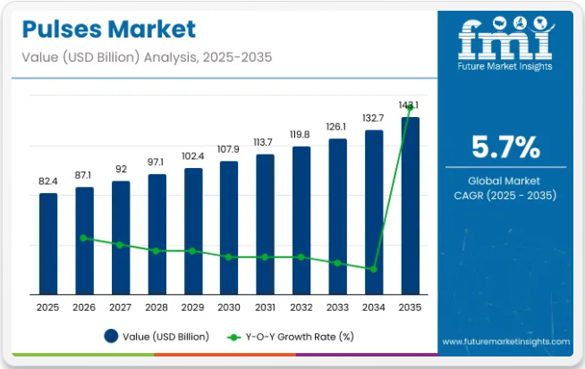 世界の豆類市場は、2025年の推定824億米ドルから2035年までに約1,431億米ドルに達すると予測されており、予測期間中に安定した5.7%のCAGR(年平均成長率)を示す見込みです。植物性タンパク質や機能性食品原料への需要増加が、この市場拡大を牽引している。