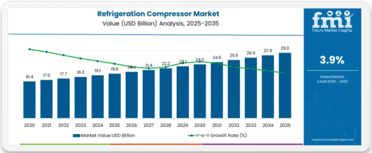 世界の冷凍コンプレッサー市場は、2025年の198億米ドルから2035年までに約290億米ドルへ成長し、予測期間中に91億米ドルの絶対増加を記録すると予測されています。これは総成長率46%に相当し、2025年から2035年にかけて市場は年平均成長率(CAGR)3.9%で拡大すると予測される。