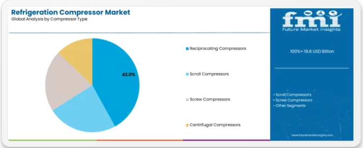 レシプロ圧縮機は、2025年に冷凍圧縮機市場の42%を占めると予測されている。この主導的なシェアは、確立された製造インフラ、幅広い用途の汎用性、およびコスト効率の高いメンテナンス要件によって支えられている。
