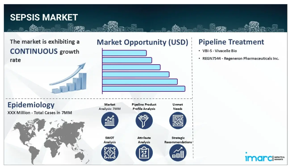 IMARC Groupの新報告書は、米国、EU4(ドイツ、スペイン、イタリア、フランス)、英国、日本における敗血症市場を包括的に分析しております。これには治療実践、市場流通中および開発中の薬剤、個別療法のシェア、主要7市場における市場動向、主要企業とその薬剤の市場実績などが含まれます。また、主要7市場における現在および将来の患者数についても提示しております。本報告書によれば、米国は敗血症患者数が最も多く、治療市場としても最大規模を占めています。さらに、現行の治療実践/アルゴリズム、市場推進要因、課題、機会、償還状況、未充足医療ニーズなども記載されています。本報告書は、製造業者、投資家、ビジネス戦略家、研究者、コンサルタント、ならびに敗血症市場に関与している、または参入を計画している全ての方にとって必読の資料です。