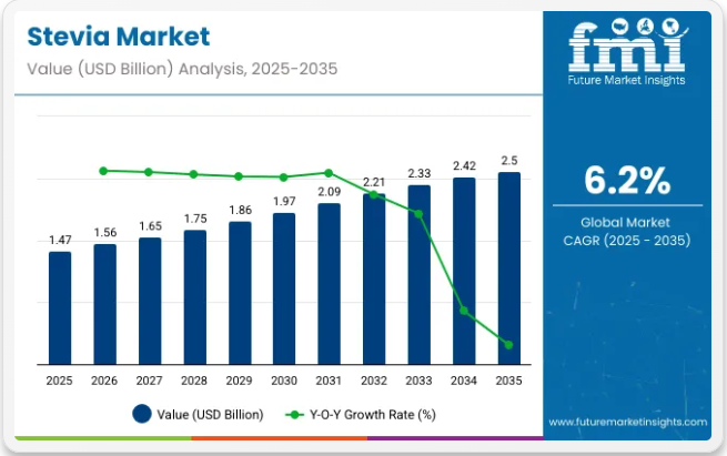世界のステビア市場は、2025年に14億7,000万米ドル、2035年までに25億米ドルの規模に達すると予測されています。ステビアの需要は、予測期間中に6.2%の年平均成長率(CAGR)を記録すると見込まれています。