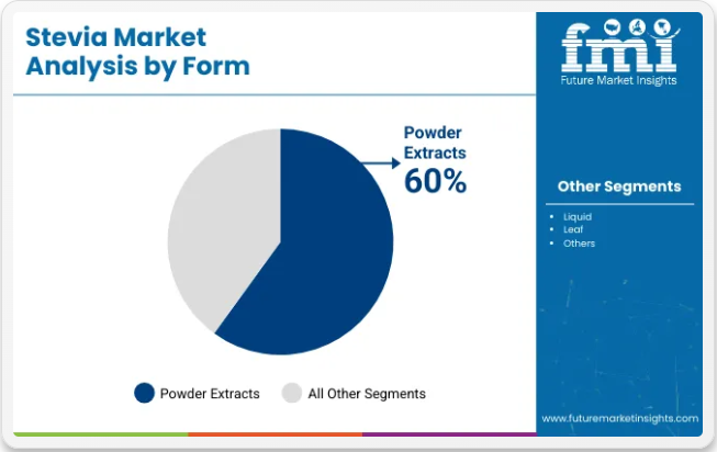 市場の大部分は従来品ステビア抽出物、特にレバウディオサイドA・Bなどのグリコシドが占めると予想される。これらは確立された有効性と調製容易性から好まれている。粉末抽出物形態は保存期間の長期化、混和性の向上、輸送の容易さから、2025年時点で60%の最高シェアを維持すると予測される。