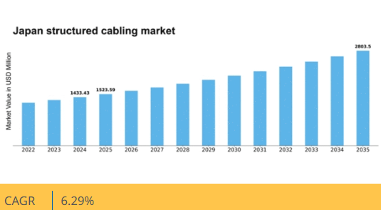 日本の構造化配線市場は、技術進歩と高速接続需要の増加を背景に、2024年から2035年にかけて年平均成長率(CAGR)6.29%で拡大すると予測される。
