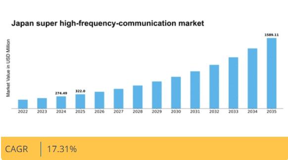 日本の超高周波通信市場は、技術進歩と高速データ伝送需要の増加を背景に、2024年から2035年にかけて年平均成長率(CAGR)17.31%で成長すると予測される。
