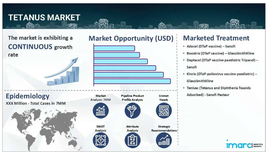 IMARC Groupの新報告書は、米国、EU4(ドイツ、スペイン、イタリア、フランス)、英国、日本における破傷風市場について包括的な分析を提供します。これには、治療実践、市場流通中および開発中の薬剤、個別療法のシェア、7大市場における市場動向、主要企業とその薬剤の市場実績などが含まれます。本レポートではさらに、7大市場における現在および将来の患者数についても提示しております。レポートによれば、米国は破傷風の患者数が最も多く、その治療市場においても最大規模を占めております。さらに、現在の治療実践/アルゴリズム、市場推進要因、課題、機会、償還シナリオ、未充足医療ニーズなども本報告書に記載されております。本報告書は、製造業者、投資家、ビジネス戦略家、研究者、コンサルタント、ならびに破傷風市場に関与している、または参入を計画しているあらゆる関係者にとって必読の資料です。