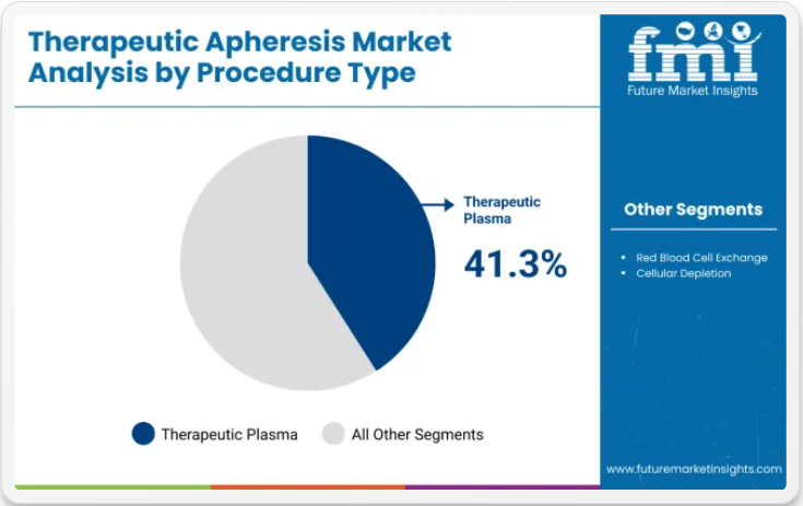 治療的血漿交換(TPE)は2025年に市場の41.3%を占め、最も広く採用されているアフェレーシス処置であり続けている。自己免疫疾患、神経内科疾患、血液疾患の管理におけるその有効性が強い需要を支えている。重症筋無力症、ギラン・バレー症候群、血栓性血小板減少性紫斑病などの疾患の有病率の増加が、処置件数を押し上げ続けている。