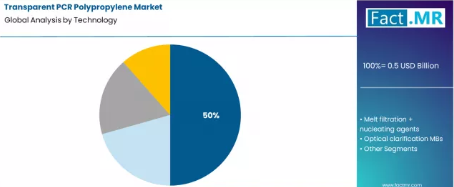 高度な脱臭・透明化技術が50.0%という圧倒的なシェアを占めています。このセグメントが主導的な地位にある理由は、PCR-PPの透明性を実現するには、単に透明化剤を用いるだけでは不十分であり、まず、色調の原因ともなる臭気の原因となる揮発性物質や不純物を徹底的に除去する必要があるからです。
