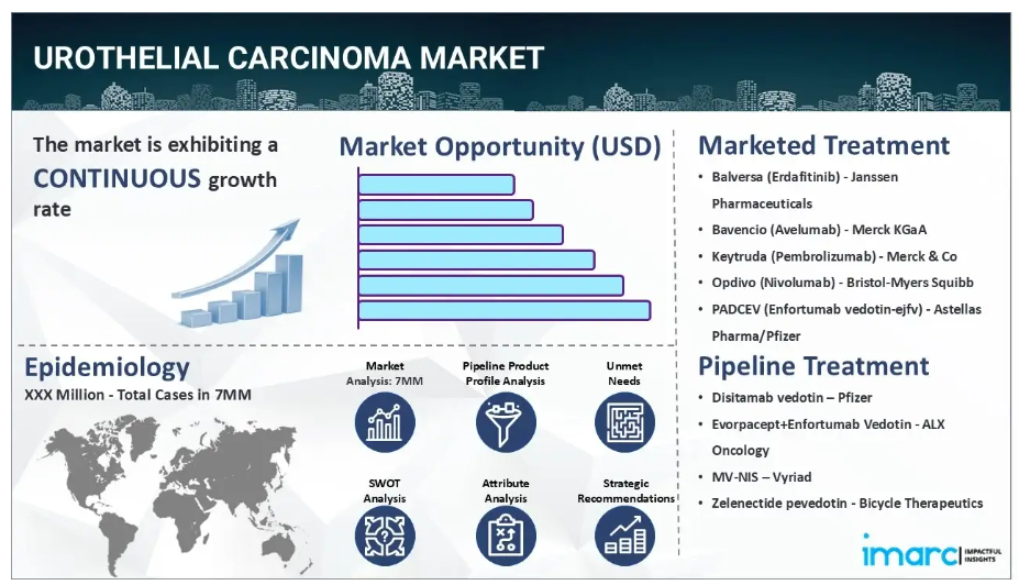 IMARC Groupの新報告書は、米国、EU4(ドイツ、スペイン、イタリア、フランス)、英国、日本における尿路上皮癌市場を包括的に分析しております。これには、治療実践、市場流通中および開発中の薬剤、個別療法のシェア、主要7市場における市場動向、主要企業とその薬剤の市場実績などが含まれます。また、主要7市場における現在および将来の患者数についても提示しております。本報告書によれば、米国は尿路上皮癌の患者数が最も多く、治療市場としても最大規模を占めています。さらに、現在の治療実践/アルゴリズム、市場推進要因、課題、機会、償還状況、未充足医療ニーズなども本報告書で提供されています。本報告書は、製造業者、投資家、ビジネス戦略家、研究者、コンサルタント、および尿路上皮癌市場に関与している、あるいは参入を計画している全ての方にとって必読の資料です。