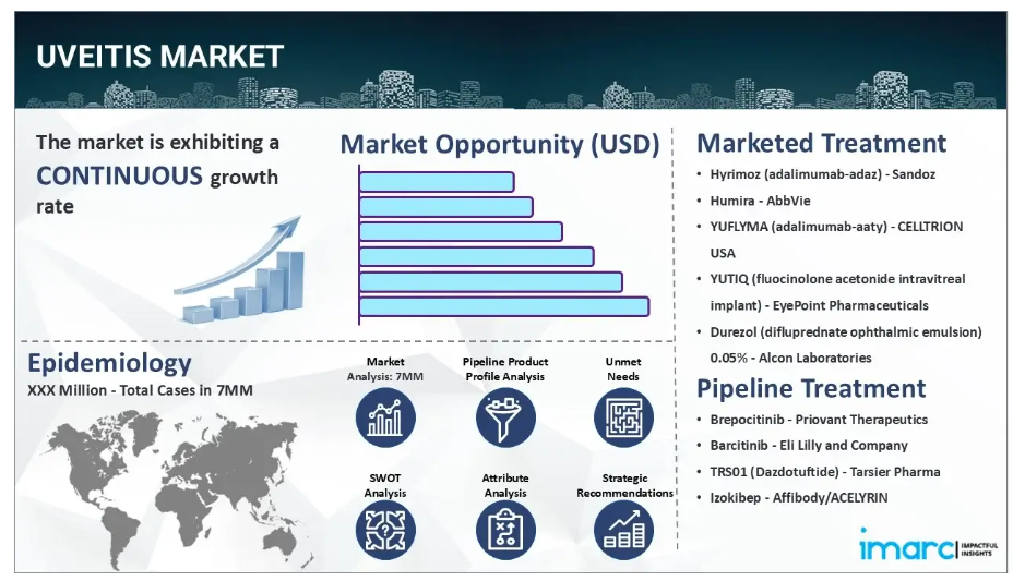 IMARC Groupの新報告書は、米国、EU5(ドイツ、スペイン、イタリア、フランス、英国)、および日本におけるぶどう膜炎市場について包括的な分析を提供します。これには、治療実践、市場流通中および開発中の薬剤、個別療法のシェア、7大市場における市場実績、主要企業とその薬剤の市場実績などが含まれます。