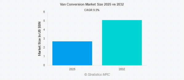 Stratistics MRCによると、バン・コンバージョンの世界市場は2025年に27億ドルを占め、予測期間中の年平均成長率は9.5%で、2032年には51億ドルに達する見込みです。バン・コンバージョンとは、標準的なバンを様々な目的のためにカスタマイズされた居住空間や特殊車両に変えることです。このプロセスでは通常、ベッド、キッチン、収納、時にはバスルームなどの設備を含むように内装を改造します。バン・コンバージョンは、キャンプやドライブ旅行、フルタイムの生活に人気があり、柔軟性と機動性を提供します。カスタマイズは、シンプルなデザインから豪華なフル装備のセットアップまで、幅広く対応できます。これらのコンバージョンは、移動オフィス、ワークショップ、レクリエーショナル・ビークルなど、特定の用途に合わせることもできます。