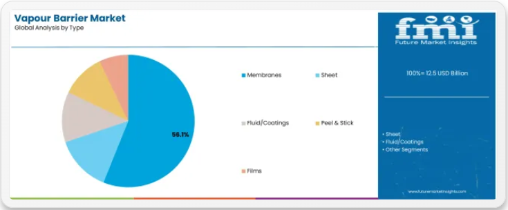 膜セグメントは2025年に防湿層市場の56.1%を占めると予測され、主要製品タイプカテゴリーとしての地位を再確認する。建築専門家は、優れた柔軟性、施工の容易さ、複雑な表面への優れた追従性、多様な気候条件や建築構造構成における一貫した性能から、膜防湿層の利用を増加させている。