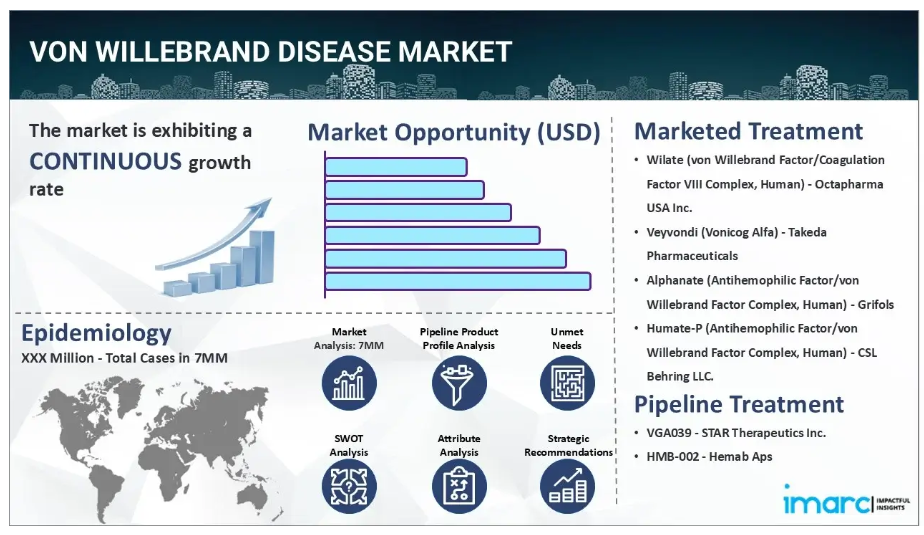 IMARC Groupの新報告書は、米国、EU4(ドイツ、スペイン、イタリア、フランス)、英国、日本におけるフォン・ヴィレブランド病市場について包括的な分析を提供しております。これには、治療実践、市場流通中および開発中の薬剤、個別療法のシェア、主要7市場における市場動向、主要企業とその薬剤の市場実績などが含まれます。また、主要7市場における現在および将来の患者数についても記載されております。本報告書によれば、フォン・ヴィレブランド病の患者数は米国が最も多く、治療市場規模も最大となっています。さらに、現在の治療実践/アルゴリズム、市場推進要因、課題、機会、償還シナリオ、未充足医療ニーズなども本報告書で提供されています。本報告書は、製造業者、投資家、ビジネス戦略家、研究者、コンサルタント、およびフォン・ヴィレブランド病市場に関与している、あるいは参入を計画している全ての方にとって必読の資料です。