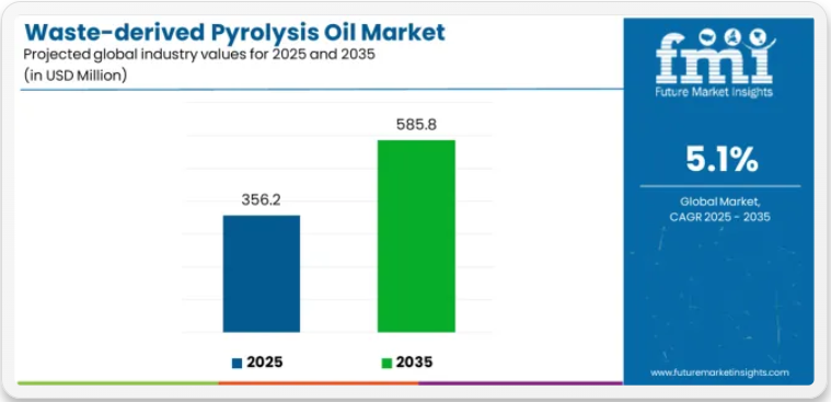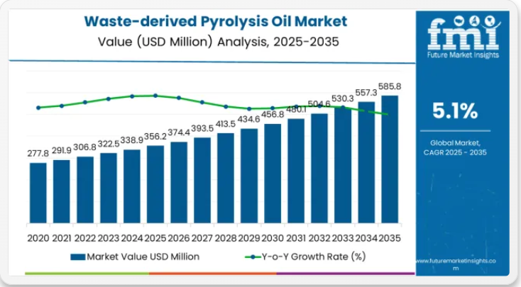 世界の廃棄物由来熱分解油市場は、2025年の3億5620万米ドルから2035年までに5億8580万米ドルへ成長し、年平均成長率(CAGR)5.1%で拡大すると予測される。この業界は、循環型経済技術と廃棄物エネルギー変換ソリューションを再構築する10年にわたる拡大軌道への入り口に立っている。2025年の3億5620万米ドルから2035年までに5億8580万米ドルへ至る市場の軌跡は著しい成長を示しており、廃棄物管理、再生可能エネルギー、化学的リサイクル分野における先進的な熱分解技術と熱変換システムの採用加速を裏付けている。