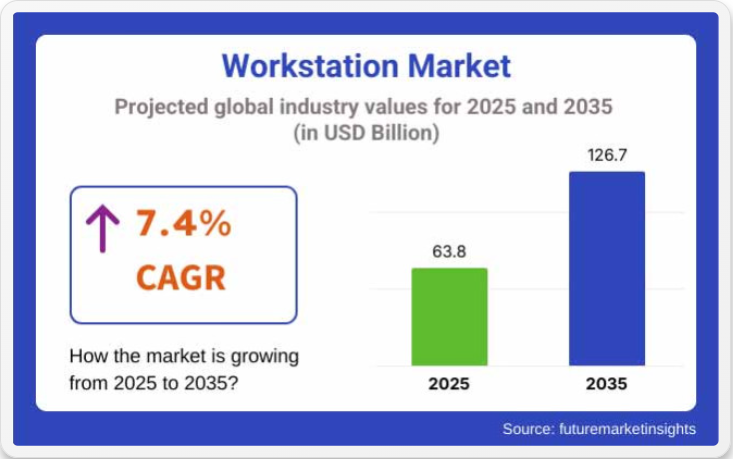 世界のワークステーション市場は今後10年間で大幅な成長が見込まれており、2025年の推定市場規模は638億米ドル、2035年までに倍増して1,267億米ドルに達すると予測されています。この成長は7.4%という高い年平均成長率(CAGR)に支えられており、様々な業界におけるワークステーションソリューションへの強い需要を示しています。