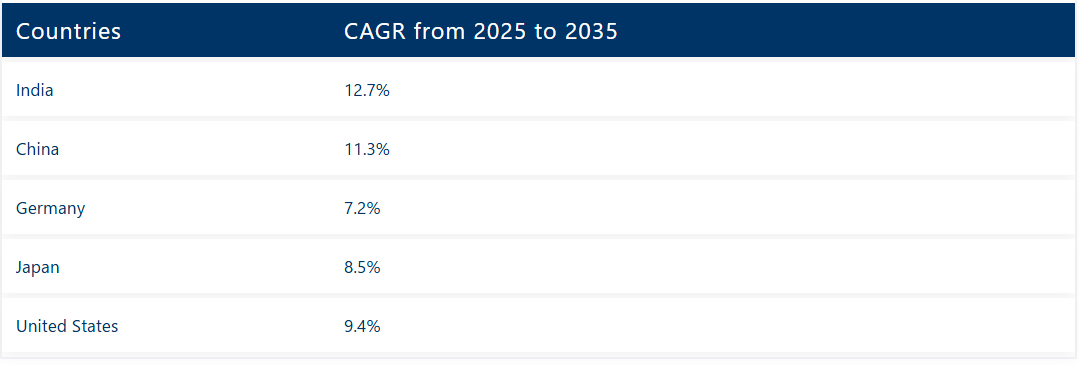 国別 2025年から2035年までのCAGRインド 12.7%中国 11.3%ドイツ 7.2%日本 8.5%米国 9.4%