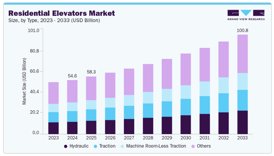 本レポートは、2021年から2033年までの各サブセグメントにおける最新の業界動向分析を提供するとともに、グローバル、地域、国レベルでの収益成長を予測します。グランドビューリサーチは、本調査において、グローバル家庭用エレベーター市場レポートを種類、事業、地域に基づいてセグメント化しました。