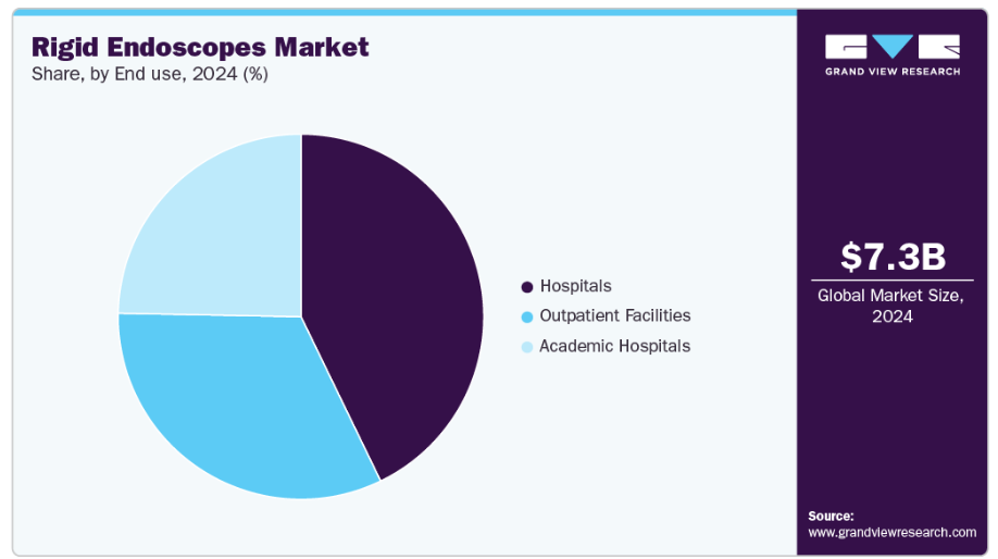 エンドユース別では、2024年に病院セグメントが42.71%の収益シェアを占め、市場を牽引しております。病院は硬性内視鏡のエンドユース分野において最大の収益シェアを占め、主導的な立場にあります。この分野には、一般外科、婦人科、泌尿器科、肥満外科、整形外科、胸部外科など幅広い分野の手術を扱う公立病院、私立病院、総合病院、三次医療病院が含まれます。硬性内視鏡は緊急手術や予定手術に不可欠であり、ほとんどの手術室に標準装備されています。病院では通常、複数の直径と長さのオートクレーブ対応硬性内視鏡を多数保有しており、効率的な回転率、複数処置への対応、滅菌プロトコルの遵守を可能にしております。オリンパス、カールストルツ、ストライカー、リチャード・ウルフなどの主要OEMメーカーは、資本パッケージやサービス契約(交換サイクル、スコープ追跡システム、統合型ビデオタワーを含む)を通じて病院チェーンに供給することが多いです。