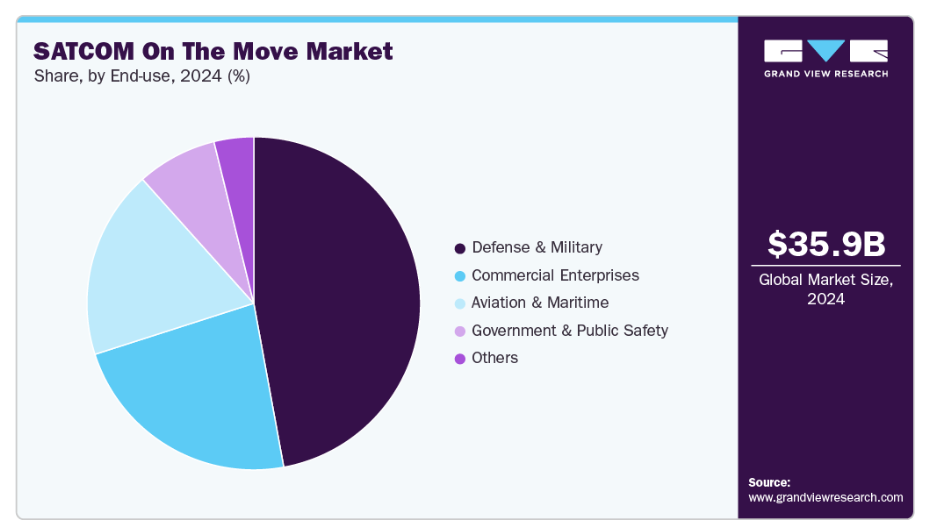 防衛・軍事セグメントは、遠隔地や移動中の作戦環境における安全なリアルタイム通信の需要拡大を背景に、2024年に47.12%という最大の収益シェアで市場をリードしました。世界各国の軍隊は、地上・海上・航空プラットフォーム全体で効果的な指揮統制、監視、情報共有能力を実現するため、移動中衛星通信システムの導入を加速しています。さらに、SOTMシステムは地上ネットワークに依存せずに運用できる特性から、紛争地域やインフラが限られた地域での作戦において極めて重要な役割を果たします。