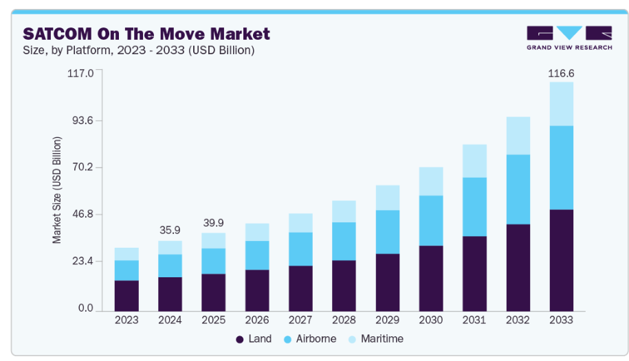 防衛・国土安全保障投資の増加は、移動中衛星通信(SATCOM on the move)産業の成長も促進しています。世界各国の軍隊は、動的な作戦環境において状況認識、指揮調整、任務継続性を確保する安全かつ移動可能な通信システムを優先しています。政府は、敵対的または地理的に分散した地形においても通信リンクを維持するため、軍用車両、海軍艦隊、航空機にSOTMシステムを導入しています。