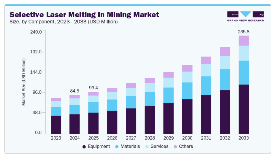 2024年において、設備セグメントは収益シェアの50%以上を占めました。設備セグメントは、運用効率の向上と材料廃棄の削減を実現する先進的な3Dプリンティングシステムの採用拡大により、堅調な成長を見せております。鉱業企業はSLM設備を導入し、掘削工具、耐摩耗部品、カスタマイズ機械向けに高精度な複雑金属部品を製造しております。SLM機械が軽量かつ耐久性に優れた部品を製造できる能力は、鉱業設備の寿命を延ばし、ダウンタイムとメンテナンスコストを削減するため、需要をさらに後押ししております。