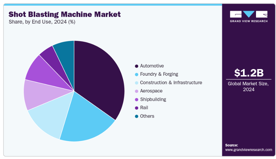 自動車セクターは市場を支配し、2024年には34.8%のシェアを占めました。これはエンジン部品、シャーシ、ボディパネルなどの金属部品の表面処理に対する高い需要によるものです。一貫した洗浄、錆除去、仕上げ処理は製品の耐久性と性能を向上させます。この産業における大規模生産の要件は、自動化され高容量の機械を好みます。さらに、自動車製造における厳格な品質基準は、先進的なブラスト装置の導入を促進しています。