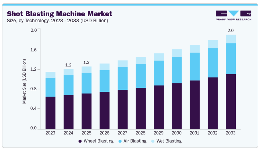 これらの機械は金属表面の洗浄、強化、研磨を支援し、製品の耐久性と性能を向上させます。造船・防衛分野における錆除去やコーティング剤用途での採用拡大が、市場の成長をさらに後押ししています。もう一つの主要な推進要因は、新興経済国における工業化とインフラ開発の進展であり、金属および加工部品の消費量増加につながっています。