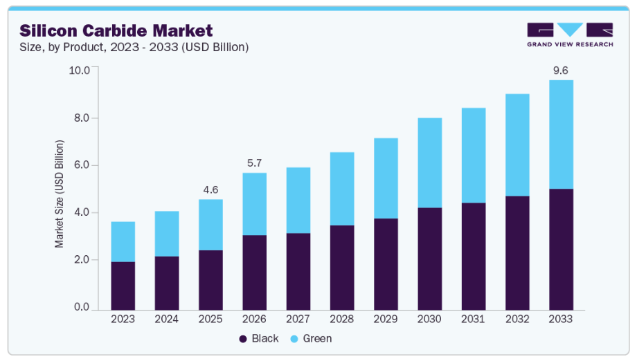 これらの特性により、SiCは電気自動車(EV)、再生可能エネルギーシステム、および高性能産業機器への応用において理想的な材料となっています。米国エネルギー省によるミシガン州でのSiCウエハー生産拡大に向けた5億4,400万ドルの融資や、欧州連合(EU)によるシチリア島でのSTマイクロエレクトロニクス社による54億ドル規模のSiCチップ工場建設に向けたイタリア政府の支援承認といった政府主導の取り組みに支えられた、世界的な電化および脱炭素化への移行は、エネルギー効率と持続可能性の目標達成におけるSiCの戦略的重要性を浮き彫りにしています。