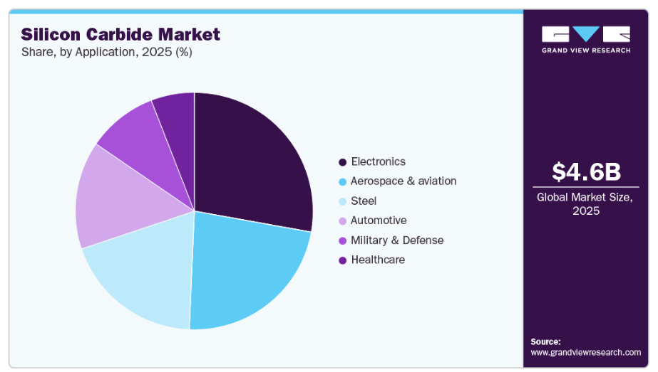 電子・電気セグメントは、高効率パワーエレクトロニクスへの急速な移行により成長しています。炭化ケイ素は、従来のシリコンと比較して、デバイスがより高い電圧、温度、およびスイッチング周波数で動作することを可能にし、エネルギー効率を直接向上させ、システムサイズを縮小します。この性能上の優位性により、電気自動車、急速充電インフラ、再生可能エネルギー用インバーター、産業用モーター駆動装置において、炭化ケイ素MOSFETおよびダイオードの採用が急速に拡大しています。