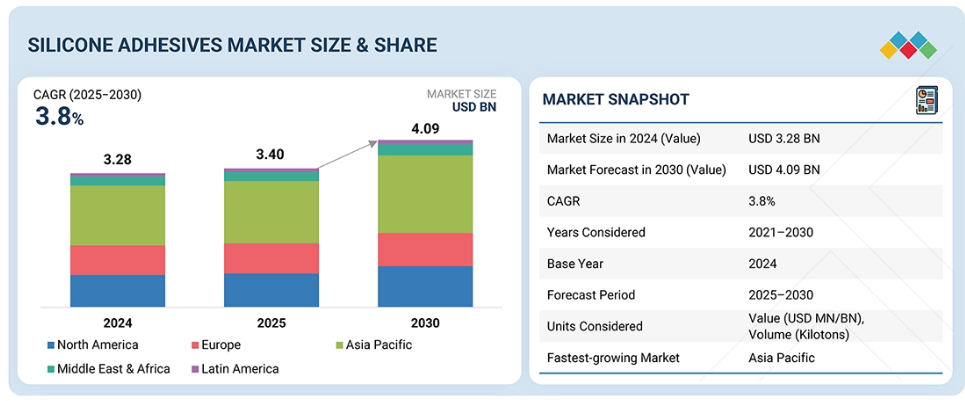 シリコーン接着剤市場は、2025年の34億米ドルから2030年までに40億9,000万米ドルに達すると予測されており、2025年から2030年にかけて年平均成長率(CAGR)3.8%で成長する見込みです。