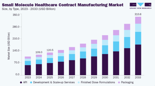 市場成長は、コスト効率の高い医薬品生産への需要増加、低分子治療薬のパイプライン拡大、および製薬企業が研究開発や商業化といった中核業務に注力するためのアウトソーシング傾向の高まりによって牽引されている。