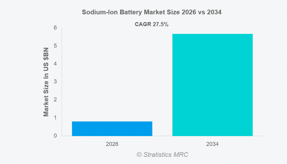Stratistics MRCによると、世界のナトリウムイオン電池市場は2026年に8億1000万ドル規模となり、予測期間中に年平均成長率(CAGR)27.5%で成長し、2034年までに56億7000万ドルに達すると見込まれています。
