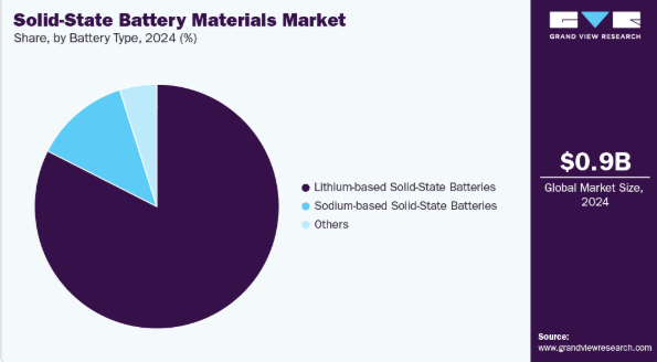 自動車セグメントは、電気自動車(EV)の普及拡大と、より安全で高容量のエネルギー貯蔵システムへの需要に牽引され、2024年に41.4%の収益シェアを占め、世界の固体電池材料市場を支配した。自動車メーカーは、航続距離の延長、充電時間の短縮、バッテリー寿命の向上を目的として、固体電池技術への投資を拡大している。主要経済圏における厳しい排出規制が、従来のリチウムイオン電池から固体電池への移行を加速させている。さらに、電池メーカーと自動車OEMメーカーとの連携が、大規模な商業化を促進している。軽量・コンパクト・熱安定性に優れた材料への注目が、このセグメントにおける市場拡大をさらに後押ししている。