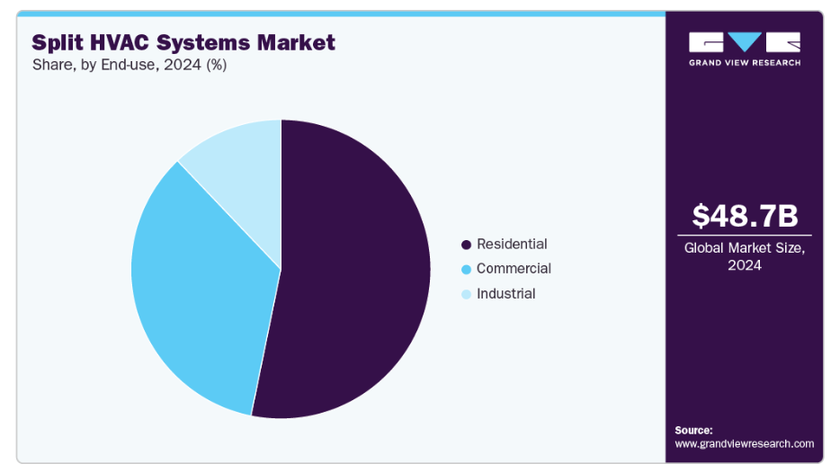 エアコンは、複雑な部品を精密に組み立てる効率性により、2024年に42.2%の最大シェアで分割型HVACシステム市場をリードしました。エアコン市場は、気温の上昇と室内空気質への意識の高まりを背景に、堅調な成長を遂げております。都市化の進展とライフスタイルの変化に伴い、より多くの消費者が家庭や事業所向けに効率的な冷却ソリューションを求めております。可変冷媒流量(VRF)システム、スマートサーモスタット、省エネユニットなどの技術革新により、エアコンの性能と省エネルギー性が向上しております。