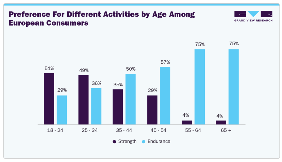 消費者は総合的な健康、フィットネス、ウェルビーイングをますます重視しており、免疫力、エネルギー、集中力をサポートする製品への需要を牽引しています。免疫力向上や腸内環境サポートなど機能的な利点を提供する製品が注目を集めています。プリンノバ・ヨーロッパ社は、フランス、ドイツ、イタリア、スペイン、英国というヨーロッパ5大市場において1,277名の消費者を対象に調査を実施し、2023年9月付で結果を発表しました。調査結果では、筋力トレーニングと持久力活動の人気に年齢層による顕著な差異が明らかになりました。18~24歳の回答者の半数以上が、筋力トレーニングやジムでのトレーニングを最も頻繁に行う運動と回答しました。一方、55歳以上の消費者は持久力活動を強く好む傾向が見られました。