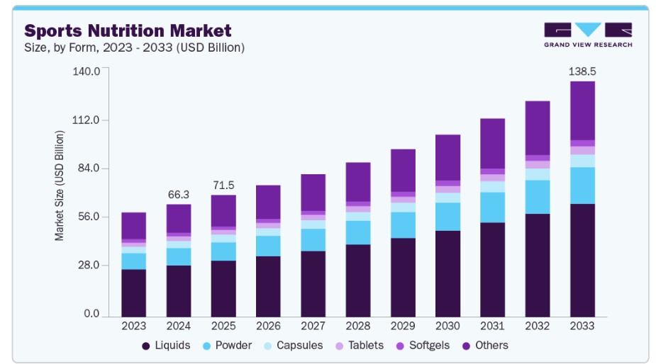 筋力と回復は、特にクロスフィットやウェイトリフティングなどの激しい活動に従事するパフォーマンス志向の消費者にとって重要な要素であり続けました。プロテインシェイクは、粉末(39%)と即飲タイプ(RTD、35%)の形式で人気のある選択肢でした。ミレニアル世代とZ世代がこれらの製品の最大の定期的なユーザー層でした。ワークアウト後の嗜好は乳製品ベースのプロテイン製品に傾いており、RTD、粉末、バーが最も好まれています。ホリスティックヘルス(総合的健康)への傾向が高まっており、消費者は身体能力の向上と精神的・感情的な健康をサポートする製品を求めています。これにより、ストレス管理や認知機能向上を目的としたアダプトゲン、ノオトロピック、その他のサプリメントを含むスポーツ製品カテゴリーの成長につながっています。