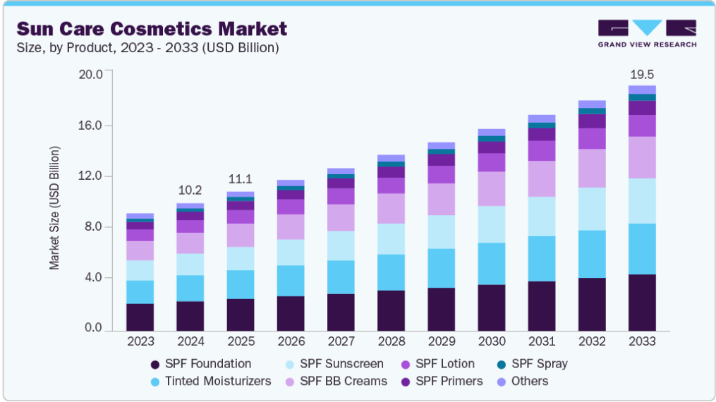 SPF日焼け止めは2025年から2033年にかけて8.2%という最速のCAGR(年平均成長率)で成長すると予測されている。SPF配合の顔用日焼け止めは、包括的な保護と複数の肌効果を提供する日常スキンケアの必須アイテムだ。有害なUVA・UVB光線から肌を遮断し、日焼けやDNA損傷を防ぎ、悪性黒色腫や扁平上皮癌などの皮膚癌リスクを大幅に低減する。さらに、コラーゲンとエラスチンを保護することで早期老化を防止する重要な役割を果たし、しわ、小じわ、日焼けによるシミを軽減します。SPF日焼け止めは、日光曝露による色素沈着、変色、斑状のシミを最小限に抑えることで、均一な肌色を維持するのにも役立ちます。