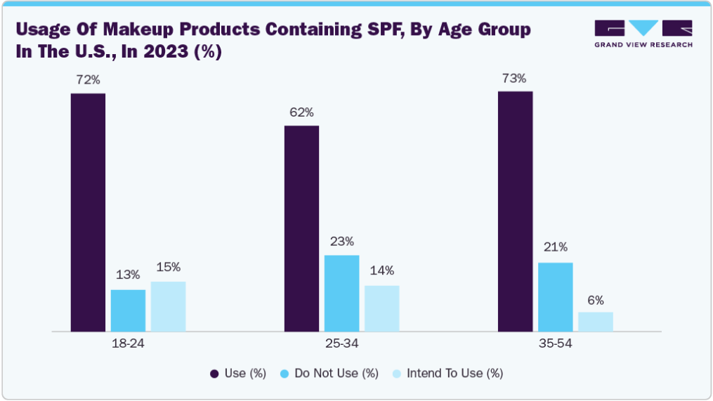 2024年、SPFファンデーションセグメントが23.33%の最大収益シェアで市場を牽引した。消費者は効果的な紫外線防御とメイクアップを兼ね備えたオールインワン製品を求めている。SPFファンデーションは日焼け止めとファンデーションの併用を不要にし、時間を節約できるため、効率的なルーティンに慣れた層に支持される。紫外線ダメージや肌老化への懸念が高まる中、ミレニアル世代とZ世代はアンチエイジングへの関心を強めている。2025年実施の調査では、ミレニアル世代女性の57%、Z世代女性の56%が老化をストレス要因としており、多くの人が早期から積極的なスキンケア対策を採用している。この予防的アプローチには、肌の健康と見た目を保つ基礎ステップとして、日常ルーティンにSPFを組み込むことが含まれる。
