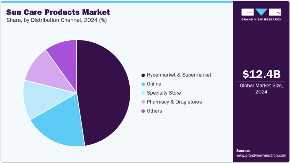 2024年にはハイパーマーケット・スーパーマーケットセグメントが最大の収益シェアを占めた。これらの店舗は多数の消費者を惹きつけ、通常は都市の中心部に位置している。様々なブランドが揃っているため、消費者は製品購入にこれらの店舗を選択する。2024年にEWGが安全かつ有効と認定したSPF製品が約500種類存在する中、消費者は古いが厳格なFDA規制下で成分リストや製品表示を評価するため、実店舗に依存している。多くの店舗では化粧品・美容コーナーに訓練を受けたスタッフが配置され、専門的な助言や推奨を提供している。これにより、化粧品需要の増加と棚スペースの縮小にもかかわらず、消費者は幅広い品揃えから容易に選択できる。