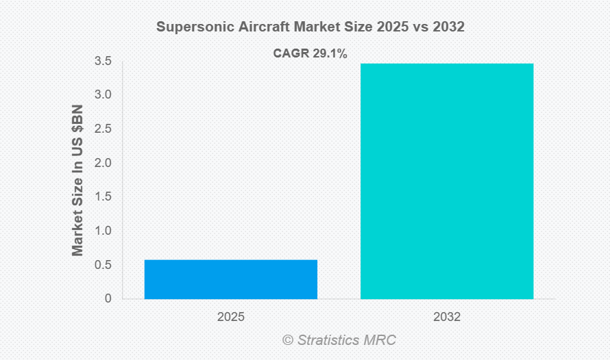 Stratistics MRCの調査によると、世界の超音速航空機市場は2025年に5億8,000万ドル規模と推計され、2032年までに34億7,000万ドルに達すると予測されています。