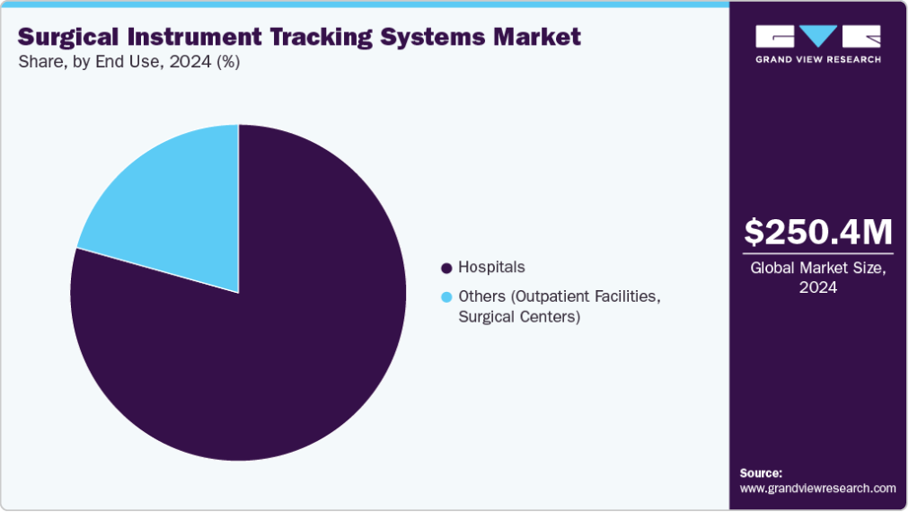 エンドユーザーセグメントは病院とその他に分類される。2024年には病院が全体の79%超のシェアを占め市場を牽引した。このシェアに寄与する要因には、手術中に体内に器具を置き忘れる事例の削減ニーズの高まりや、効果的な在庫管理が挙げられる。病院の医療機器・消耗品・設備の約20%が、サプライチェーン管理の非効率性により紛失または置き忘れられていると推定される。