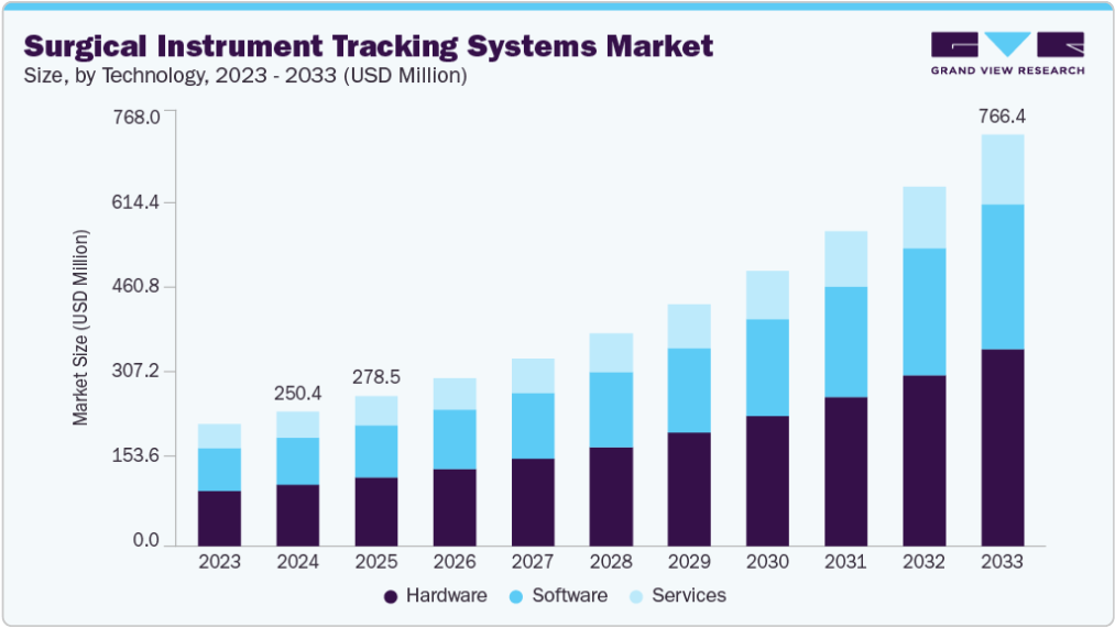 RFIDセグメントは予測期間中に最も速い成長過程を示すと予想される。これは、RFIDタグが過酷な滅菌プロセスなどの厳しい医療環境にも耐えうることに加え、追加情報の保存や各器具の修理履歴・所在といった重要統計データの記録が可能であるためである。RFIDはバーコードと比較して視線スキャンを必要としない利点もあり、この技術の採用率向上を促進すると見込まれる。