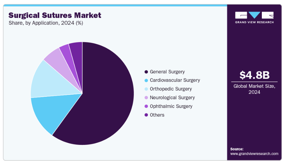 吸収性縫合糸セグメントは2024年に59.0%という最大の収益シェアで市場を支配し、予測期間中に最も速いCAGRを記録すると予想されています。吸収性縫合糸は、創傷が治癒し通常の負荷に耐えられるようになるまで一時的に支持する能力があるため、その需要は継続的に高まっています。さらに、吸収性縫合糸は自然に分解される特性から、好まれる選択肢となっております。吸収性縫合糸の市場優位性には、その組成が重要な役割を果たしております。これらの縫合糸は、カトガットなどの天然素材、あるいはポリグリコール酸、ポリ乳酸、ポリジオキサノンなどの合成ポリマーから製造されております。天然素材の縫合糸は体内で酵素的に分解される一方、合成素材は加水分解による分解を経ます。この段階的な吸収により、縫合糸は治癒の重要な期間中に十分な組織支持を提供し、除去を必要とせずに完全に吸収されるため、患者の不快感や感染リスクを軽減します。2025年7月、コルザ・メディカル社はオネテック眼科用縫合糸製品群を拡充し、繊細な眼科手術および眼形成外科手術専用に設計された約130製品を提供しています。本ポートフォリオには、高度に焼入れ処理されたステンレス鋼製の吸収性および非吸収性縫合糸が含まれます。