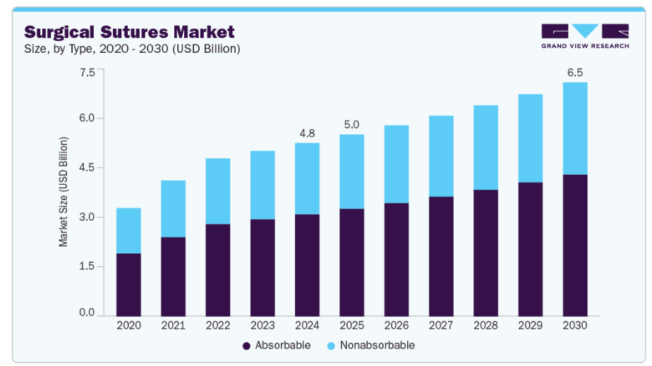 これは2025年から2030年にかけて年平均成長率(CAGR)5.2%で成長する見込みです。市場の成長は、外科手術件数の増加およびスマート縫合糸や抗菌縫合糸を含む材料・技術の進歩によって牽引されると予想されます。