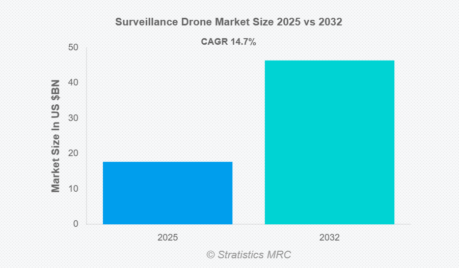 Stratistics MRCの調査によると、世界の監視ドローン市場は2025年に177億ドル規模となり、2032年までに464億ドルに達すると予測されています。