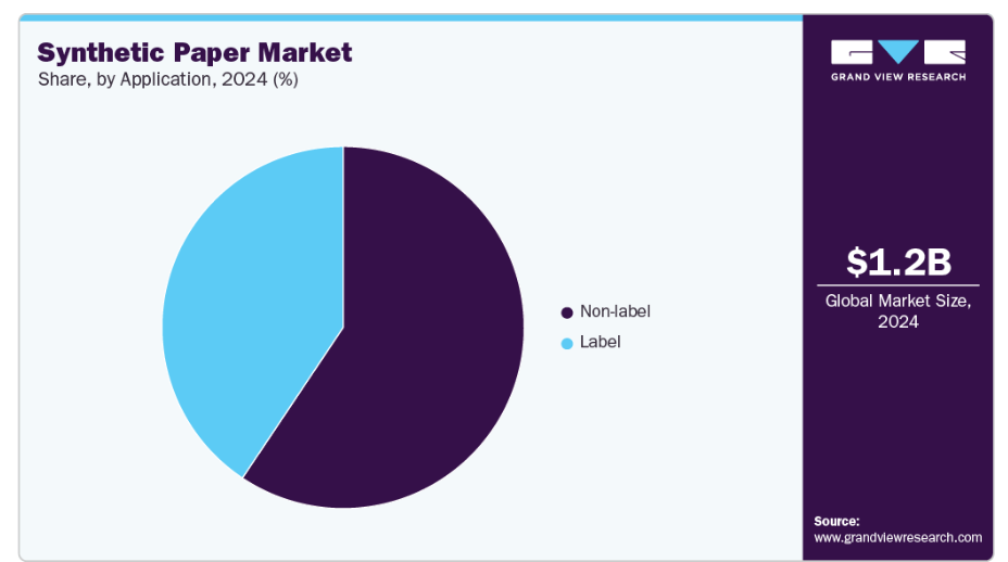 2024年時点で、非ラベル用途セグメントが市場をリードし、世界収益の約60%を占めました。合成紙の優れた耐久性と引張強度は重量物の保持に適しており、包装などの非ラベル用途に最適です。さらに、湿気や極端な高温に対する優れた耐性が、包装用途セグメントにおける成長を促進すると見込まれます。