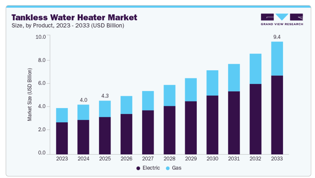 ■ 英語タイトル:Tankless Water Heater Market Size, Share & Trends Analysis Report By Product (Electric, Gas), By Application (Residential, Commercial), By Region (North America, Europe, APAC, Latin America, MEA), And Segment Forecasts, 2025 - 2033